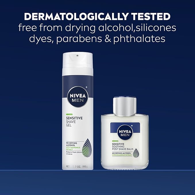 - SHAVING KIT FOR MEN: NIVEA MEN's sensitive shave gel and post shave balm are enriched with Vitamin E, Pro-Vitamin B5 and soothing Chamomile extract — these formulas are formulated without drying alcohols, parabens, phthalates and dyes