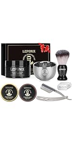 - Starter Shaving Set: LEPONIX had grouped a starter men’s shave kit with best value to begin your journey for clean shave. The manual shaving kit include Sandalwood Shaving Cream, Shave Soap, shaving brush and bowl which is a ticket to a relaxing shave & ideal for a satisfying and luxurious lather for your wet shave. The sandalwood manly scents to leave that special someone in love with your face